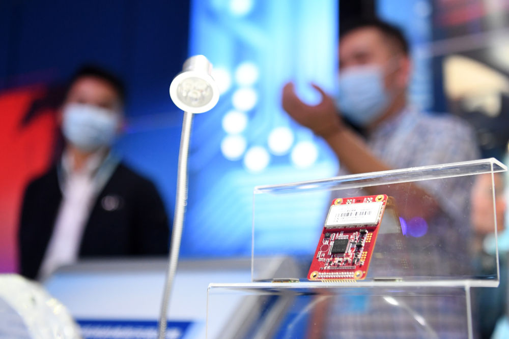 工作人员在2020线上智博会上介绍“基于北斗卫星系统的组合导航定位模块”。新华社记者 唐奕 摄