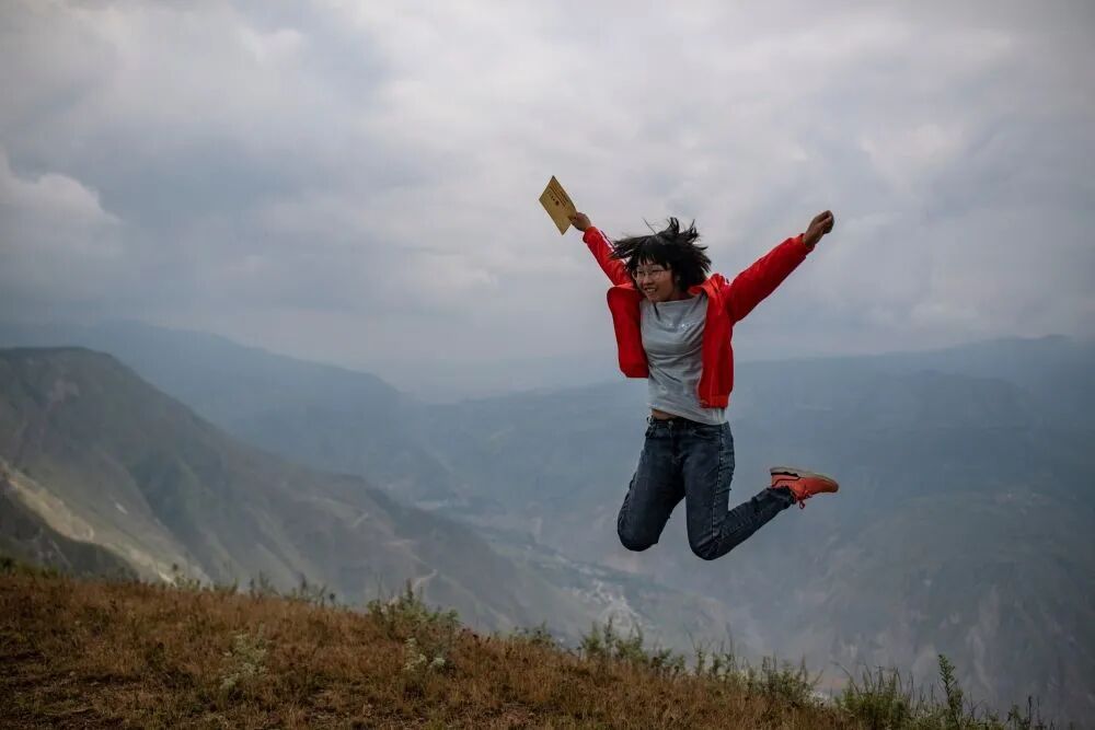 ↑范天兰拿着通知书在之前寻找信号上网课的地方庆祝。新华社记者 江文耀 摄