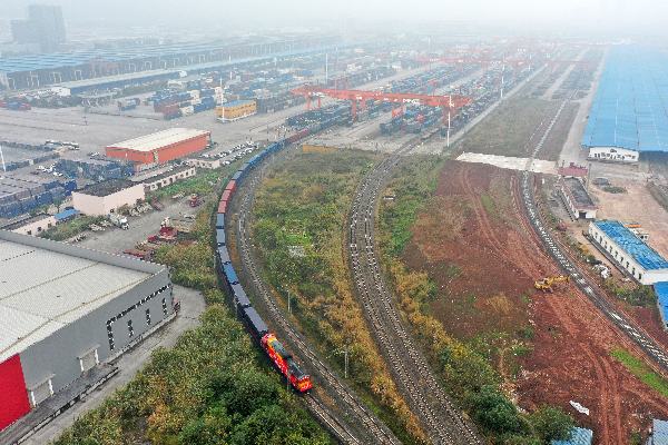 2021年1月1日,中欧班列(成渝)号首列班车从重庆团结村站发出(无人机照片)。新华社记者 唐奕 摄