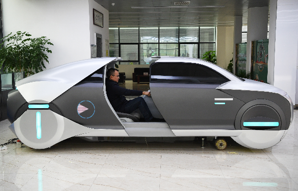 一名男子在位于“川渝高竹新区”的四川瑞创汽车科技有限公司展厅内体验概念车(2020年12月16日摄)。新华社记者 王全超 摄
