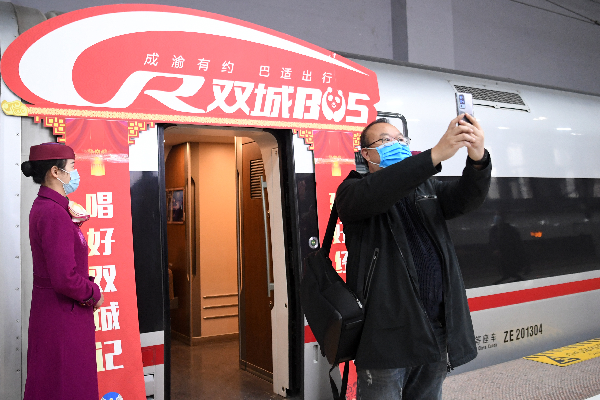 成渝间实现高铁公交化运营1小时直达,这是乘客在重庆沙坪坝站开往成都东站的G8608次“复兴号”高铁列车前留影(2020年12月24日摄)。新华社记者 唐奕 摄