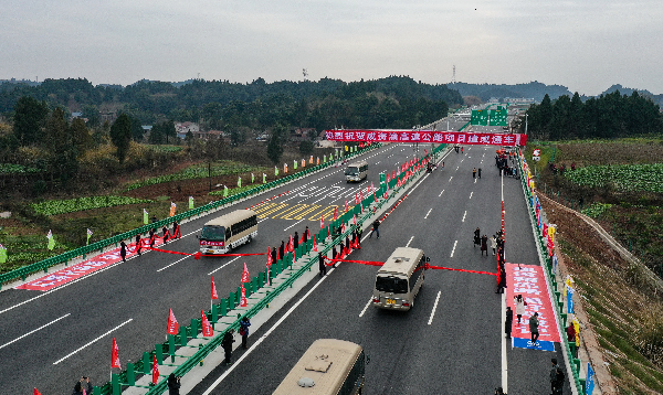 2020年12月30日,在四川省资阳市雁江区,参加撞彩仪式的车辆驶过成资渝高速公路路面。该条高速于2020年12月31日24时正式通车,是成渝城市群发展主轴上的第四条高速公路。新华社记者 王曦 摄