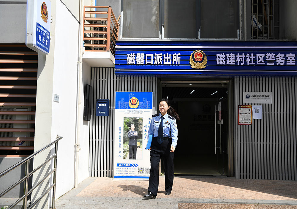 ↑4月27日,何巧走出磁建村社区警务室,准备前往社区走访。新华社记者 王全超 摄