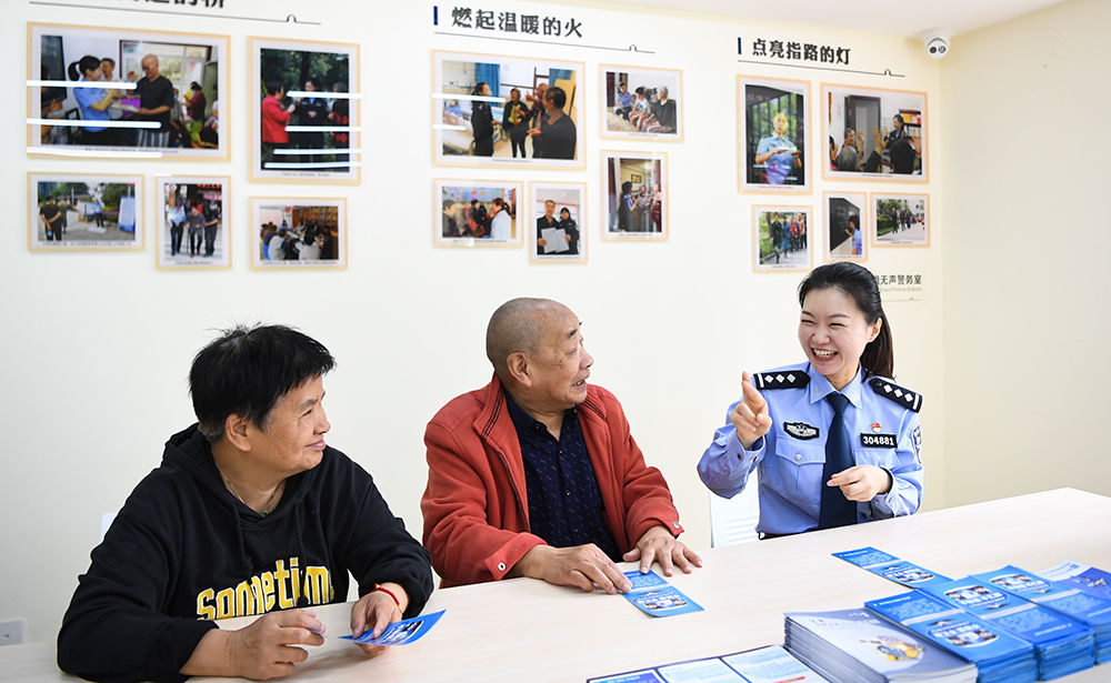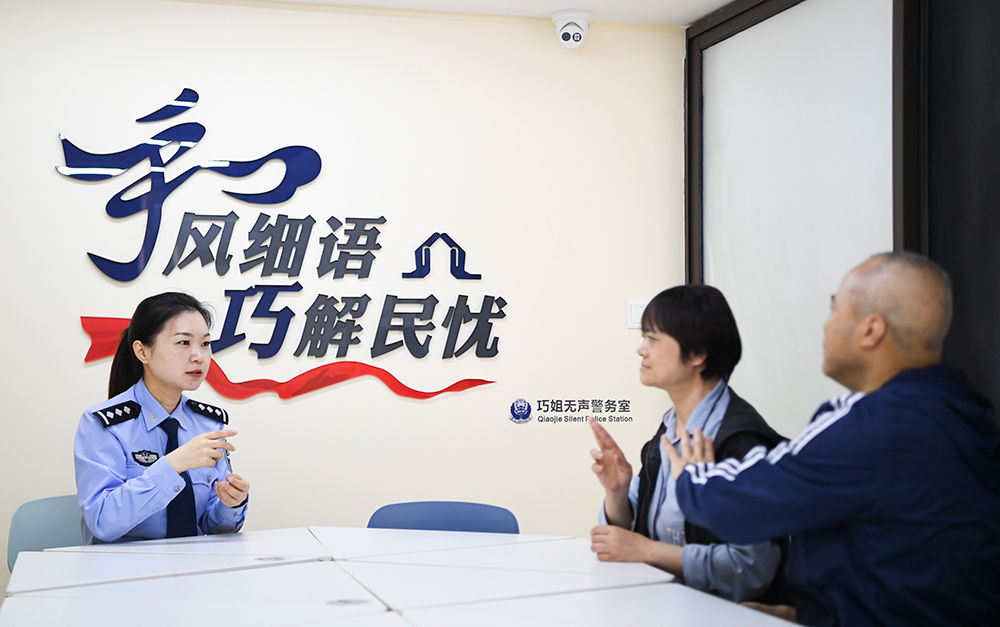↑4月27日,何巧和聋哑群众在磁建村社区警务室谈心角交流。新华社记者 王全超 摄