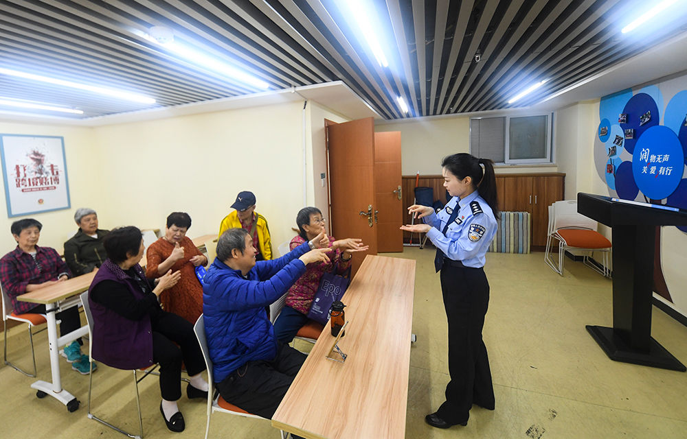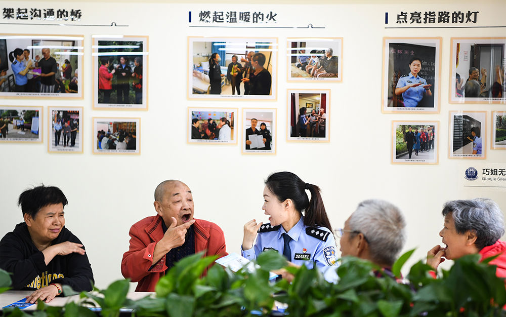 ↑4月27日,何巧(右)在磁建村社区警务室与聋哑群众交流。新华社记者 王全超 摄