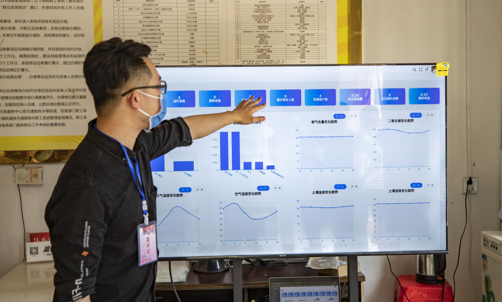 在开州区五通乡桐林村,工作人员在查看智慧大屏的相关信息。 新华社记者黄伟 摄