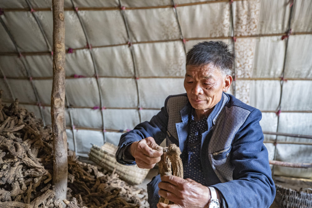 药农彭贵宗在查看烘干后的木香。 新华社记者黄伟 摄