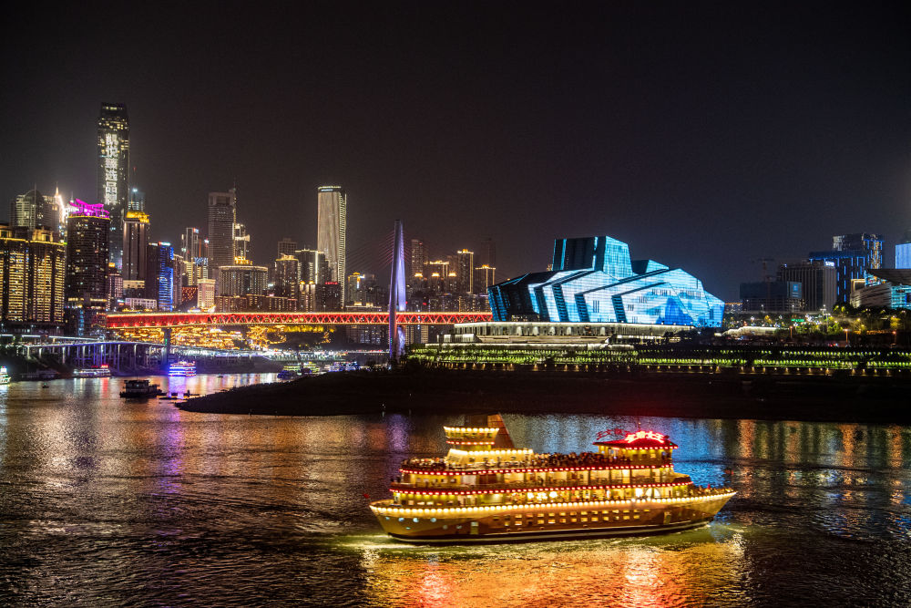 ↑2023年4月1日,一艘灯火通明的“两江游”游轮从重庆地标建筑“重庆大剧院”前驶过。