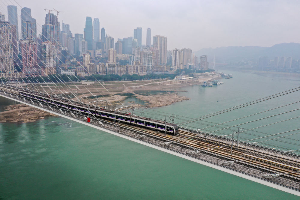 ↑2023年1月18日,重庆轨道交通10号线列车通过南纪门轨道大桥(无人机照片)。