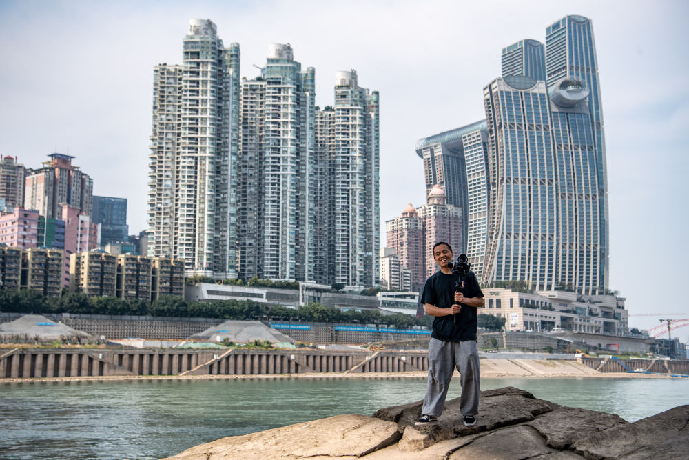 ↑2023年3月14日,文舜尧在重庆东水门长江大桥下的江心礁石上拍摄跑酷视频。