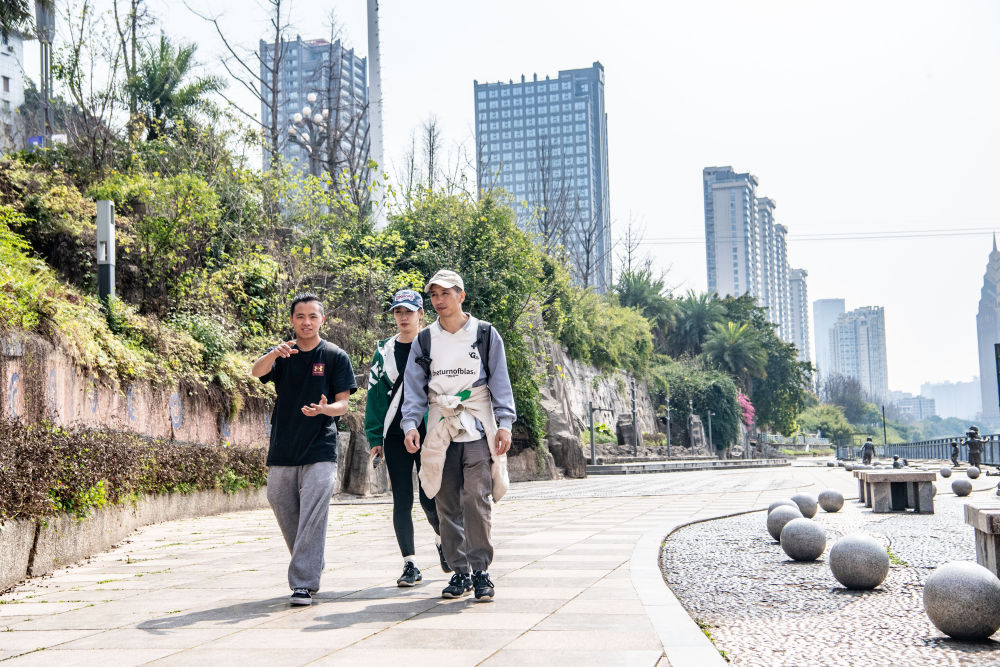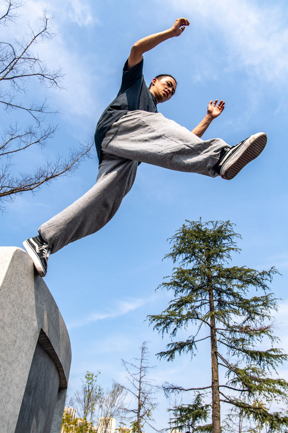 ↑2023年3月14日,重庆跃飞跑酷队员文舜尧在重庆金州公园拍摄跑酷视频。