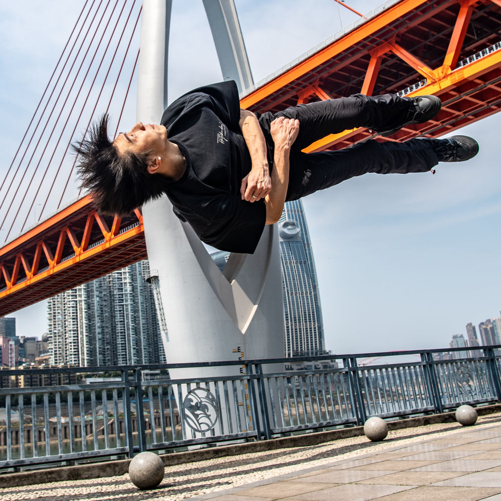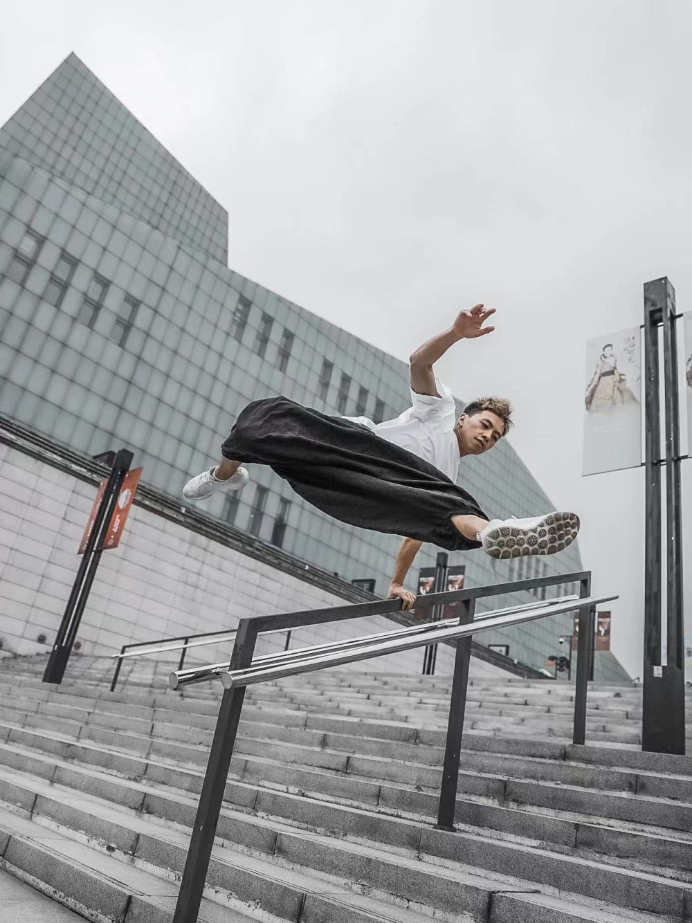 ↑上图为重庆跃飞跑酷俱乐部成员文舜尧在街头跑酷。(受访者供图)