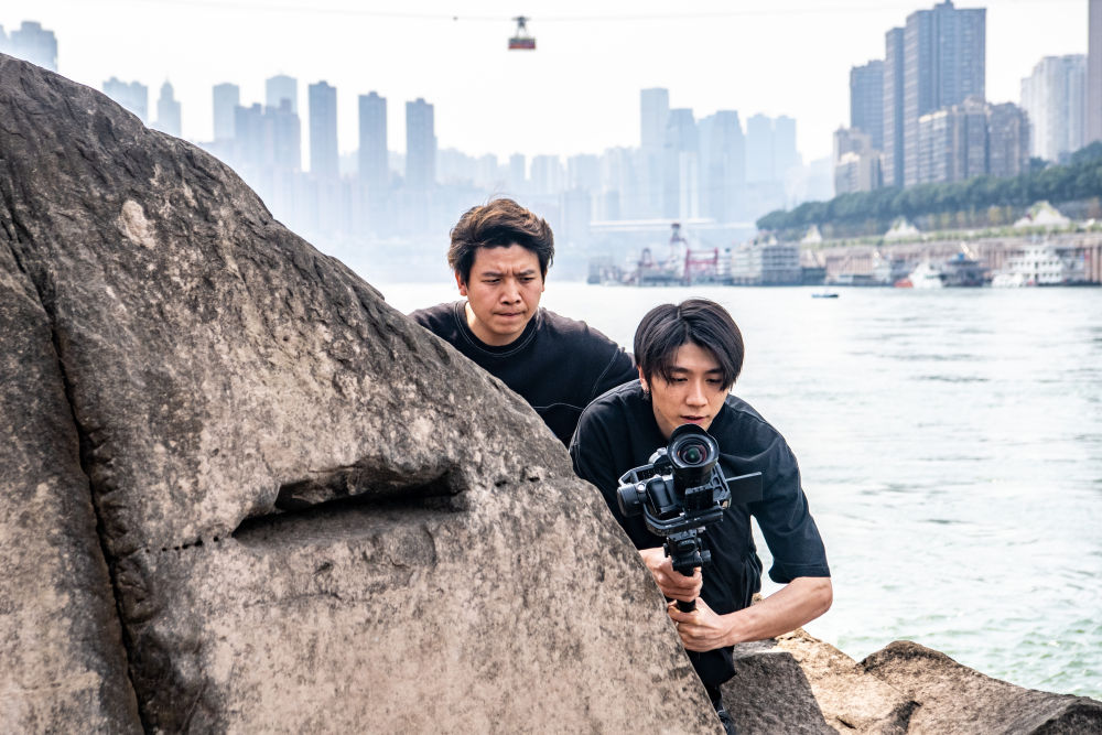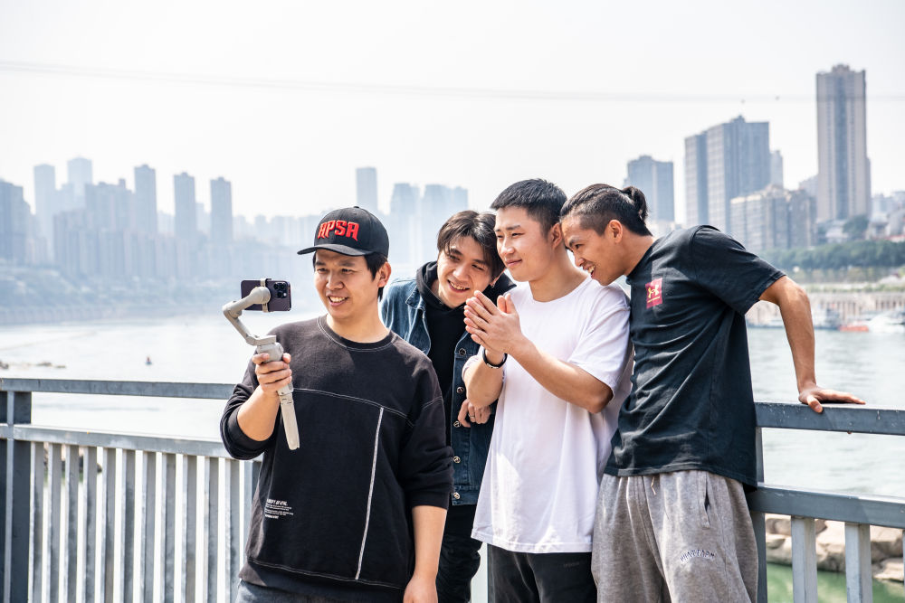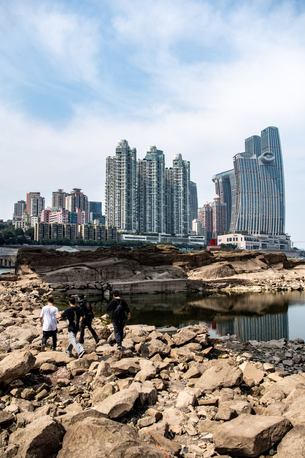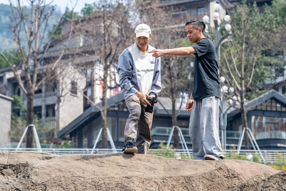 ↑2023年3月14日,文舜尧(右)与俱乐部成员在重庆东水门长江大桥下的江心礁石上寻找跑酷路线。