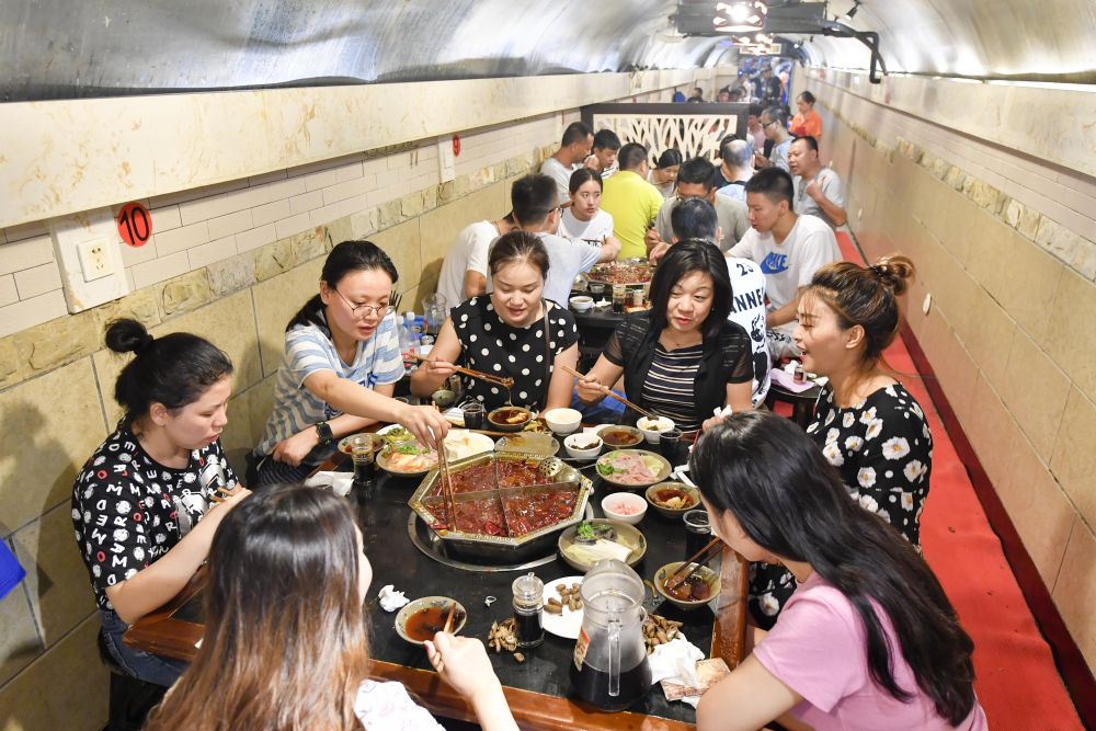 ↑2017年8月22日,在重庆市渝中区的老字号洞子火锅的防空洞餐厅内,重庆市民一边享受清凉,一边品尝美食。
