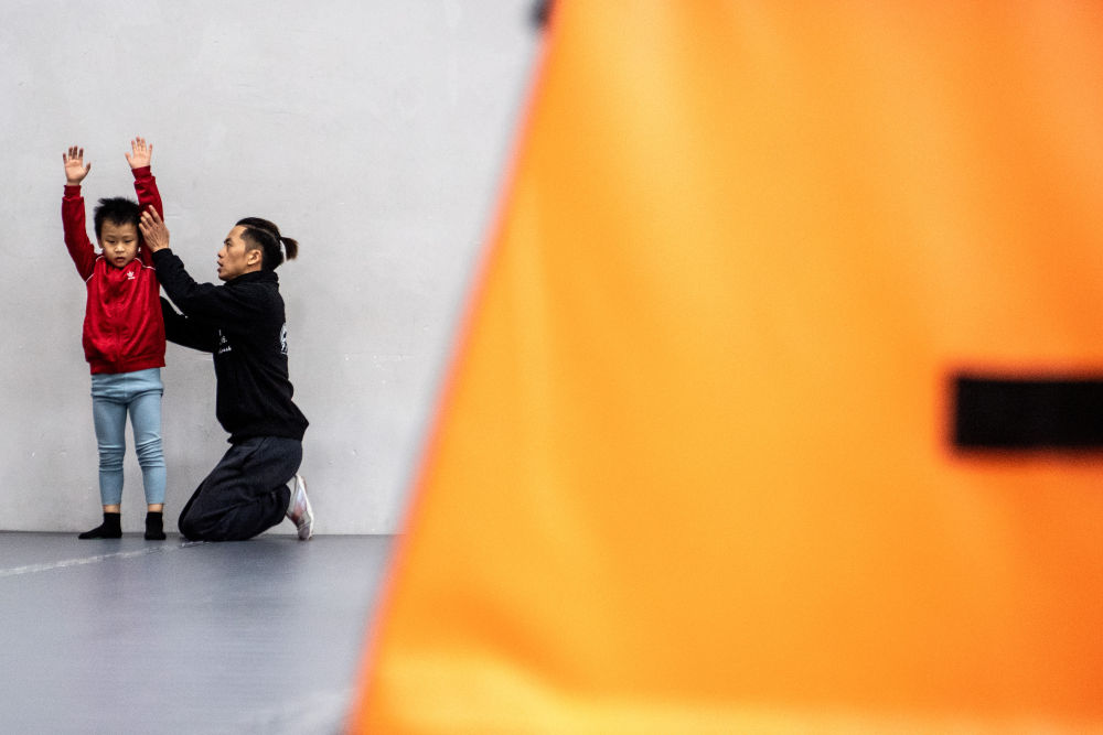 ↑2022年12月6日,文舜尧在重庆跃飞跑酷俱乐部带领小朋友进行跑酷基本动作练习。
