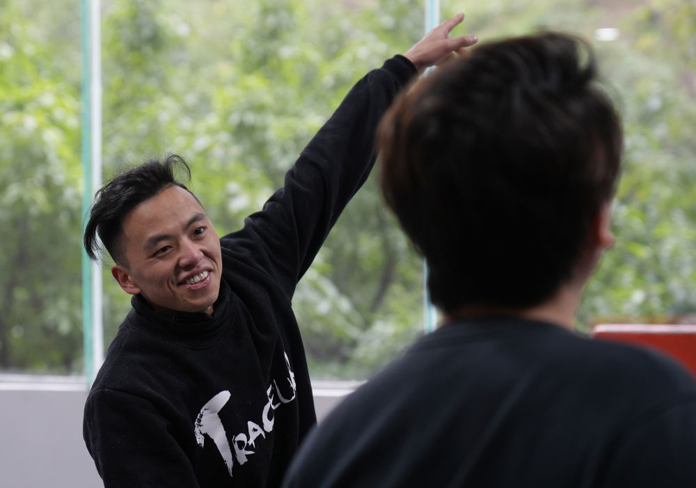 ↑2023年2月23日,文舜尧在重庆跃飞跑酷俱乐部内与同事一起讨论。