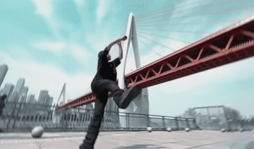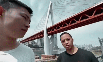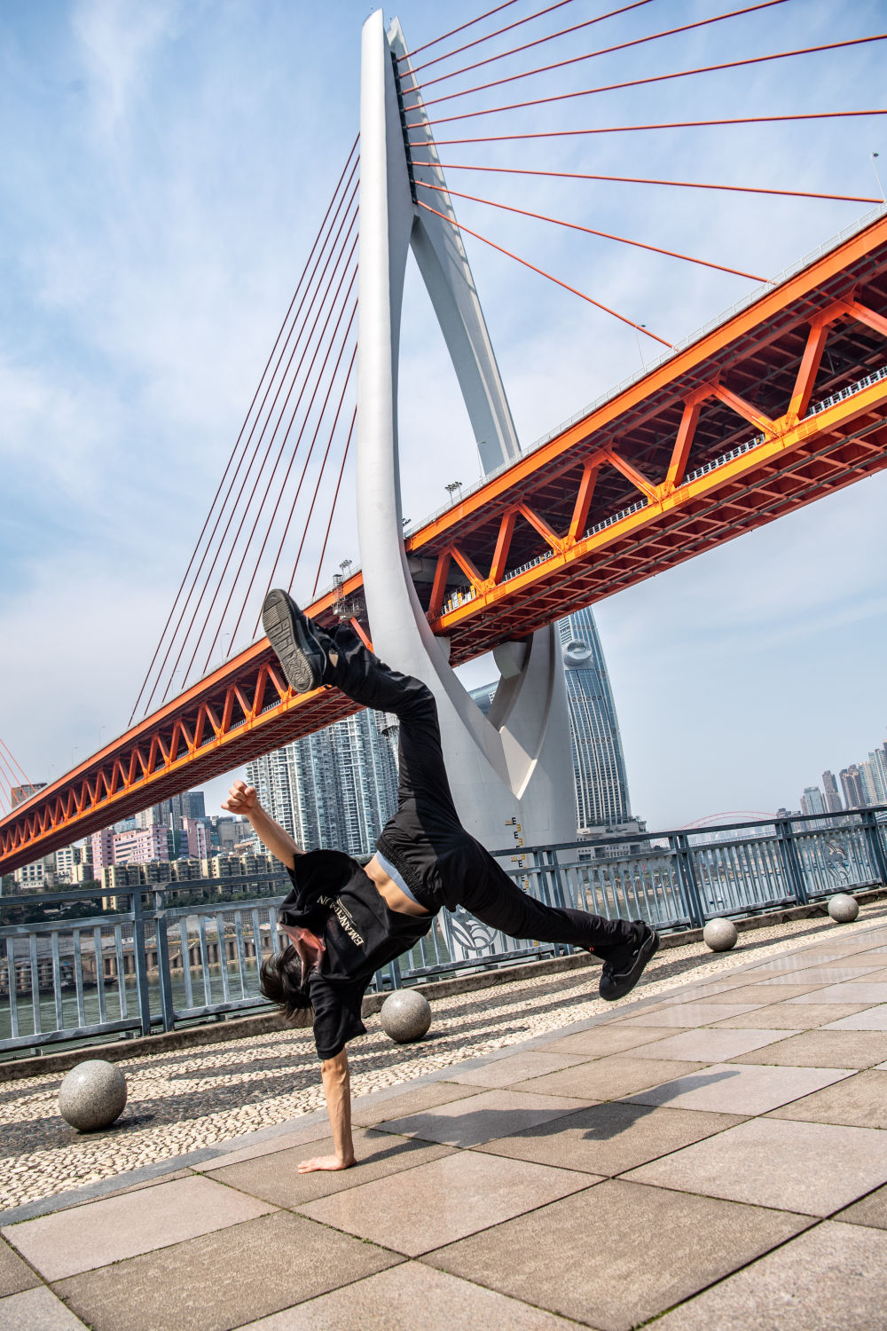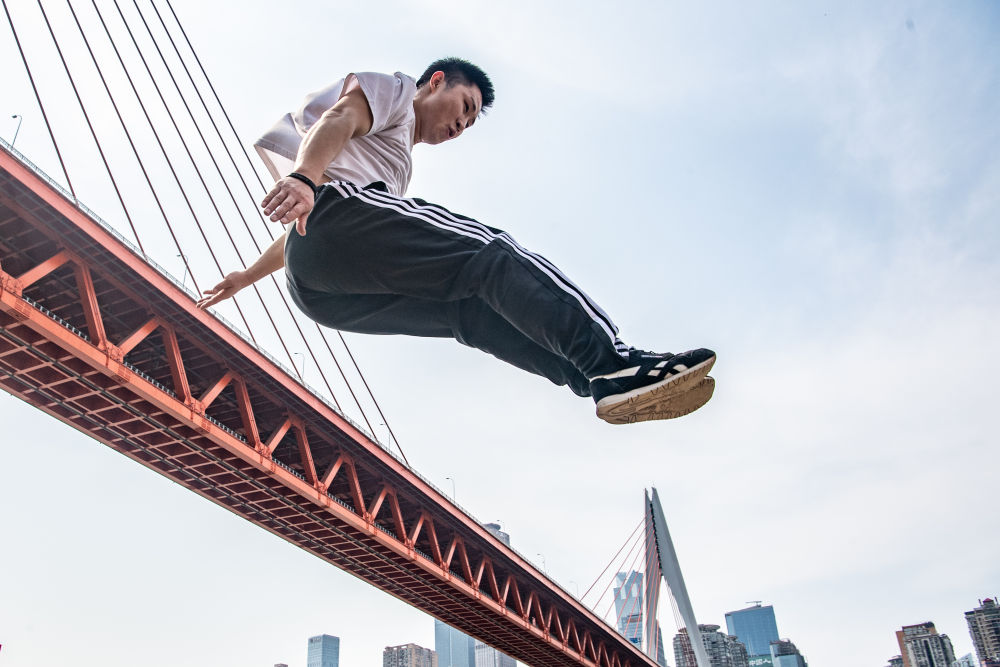 ↑2023年3月14日,重庆跃飞跑酷俱乐部成员们在重庆东水门长江大桥下的滨江路上拍摄跑酷视频。