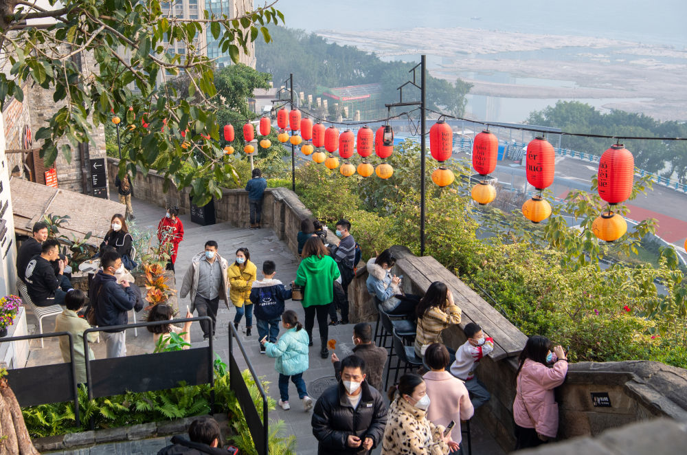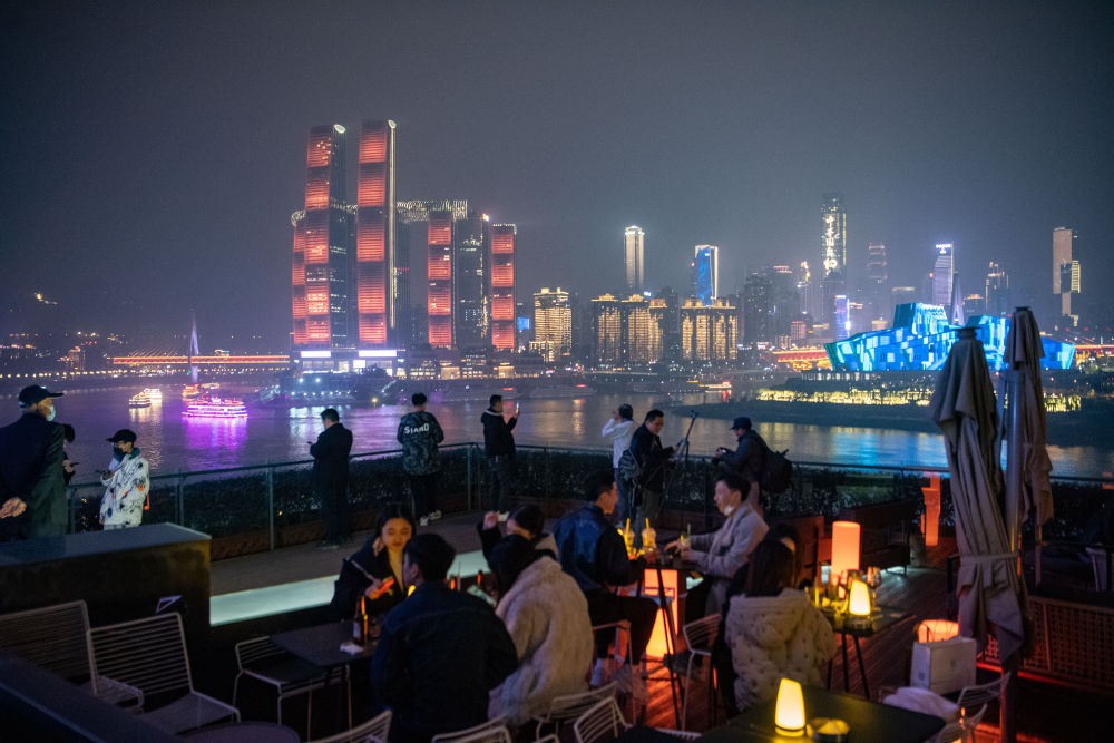 ↑2021年12月8日,游客在重庆弹子石老街里的一家酒吧品酒赏夜景。