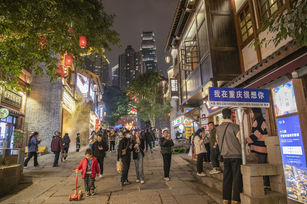 ↑2022年12月24日,市民游客在位于重庆解放碑商圈的景点山城巷游览。