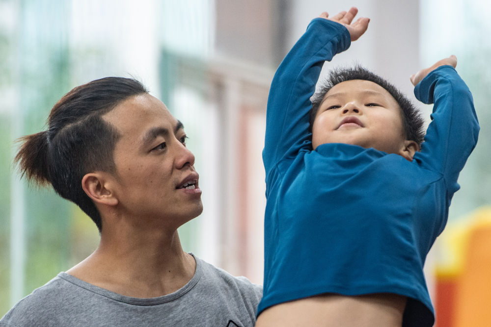 ↑2022年12月6日,文舜尧在重庆跃飞跑酷俱乐部带领小朋友在跑酷练习前进行热身运动。