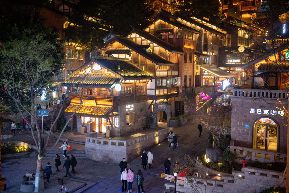 ↑2023年2月10日晚,游客在位于重庆市渝中区的“十八梯”传统风貌区休闲游览。