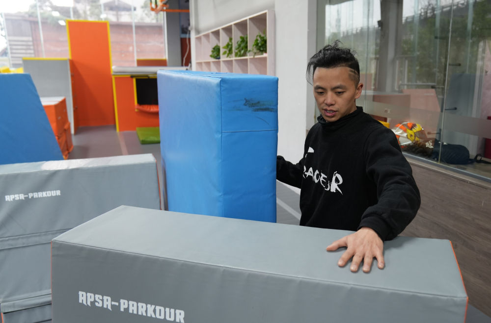 ↑2023年2月23日,文舜尧在重庆跃飞跑酷俱乐部内摆放训练器材。