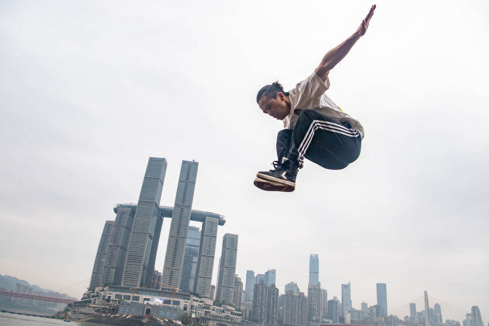 ↑2023年4月21日,重庆跃飞跑酷队员文舜尧在重庆朝天门对岸的南滨路上展示跑酷动作。