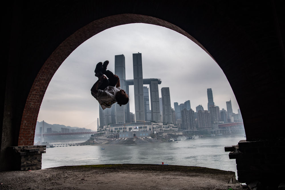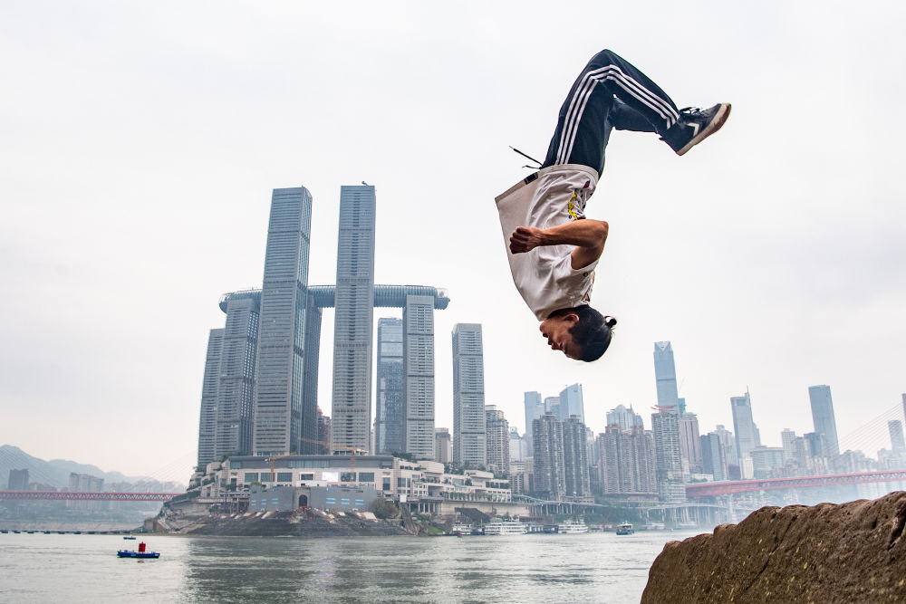 ↑2023年4月21日,重庆跃飞跑酷队员文舜尧在重庆朝天门对岸的江滩上展示跑酷动作。