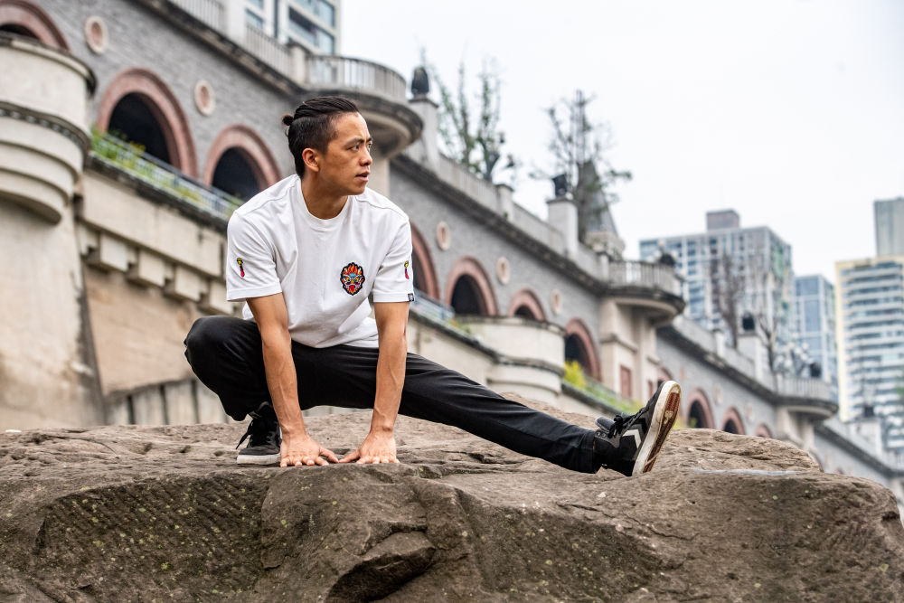 ↑2023年4月21日,重庆跃飞跑酷队员文舜尧在重庆朝天门对岸的江滩上进行热身运动。