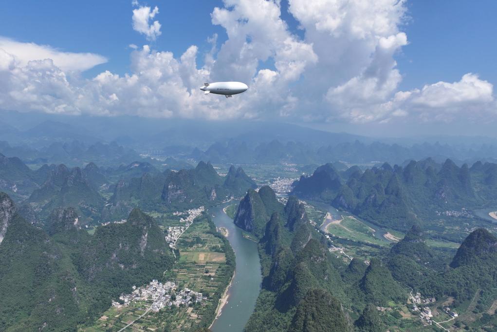 9月14日,“祥云”AS700载人飞艇在广西阳朔进行演示飞行(无人机照片)。新华社发(中国航空工业集团特种飞行器研究所供图)