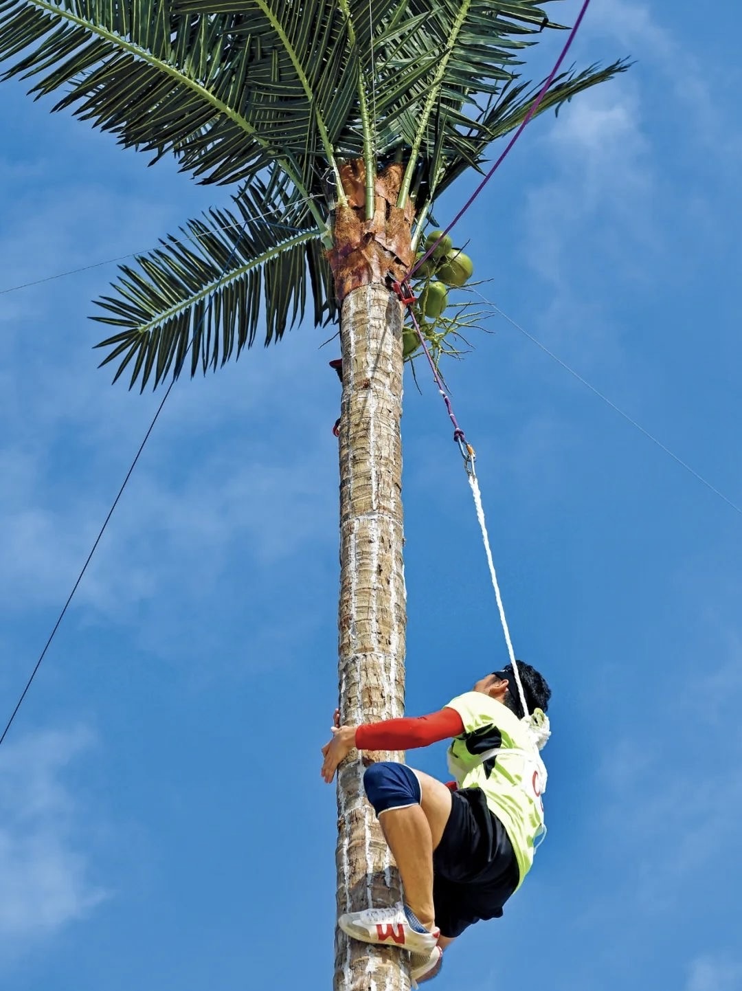 攀椰竞速源于海南当地群众爬树摘椰的生活劳作场景。