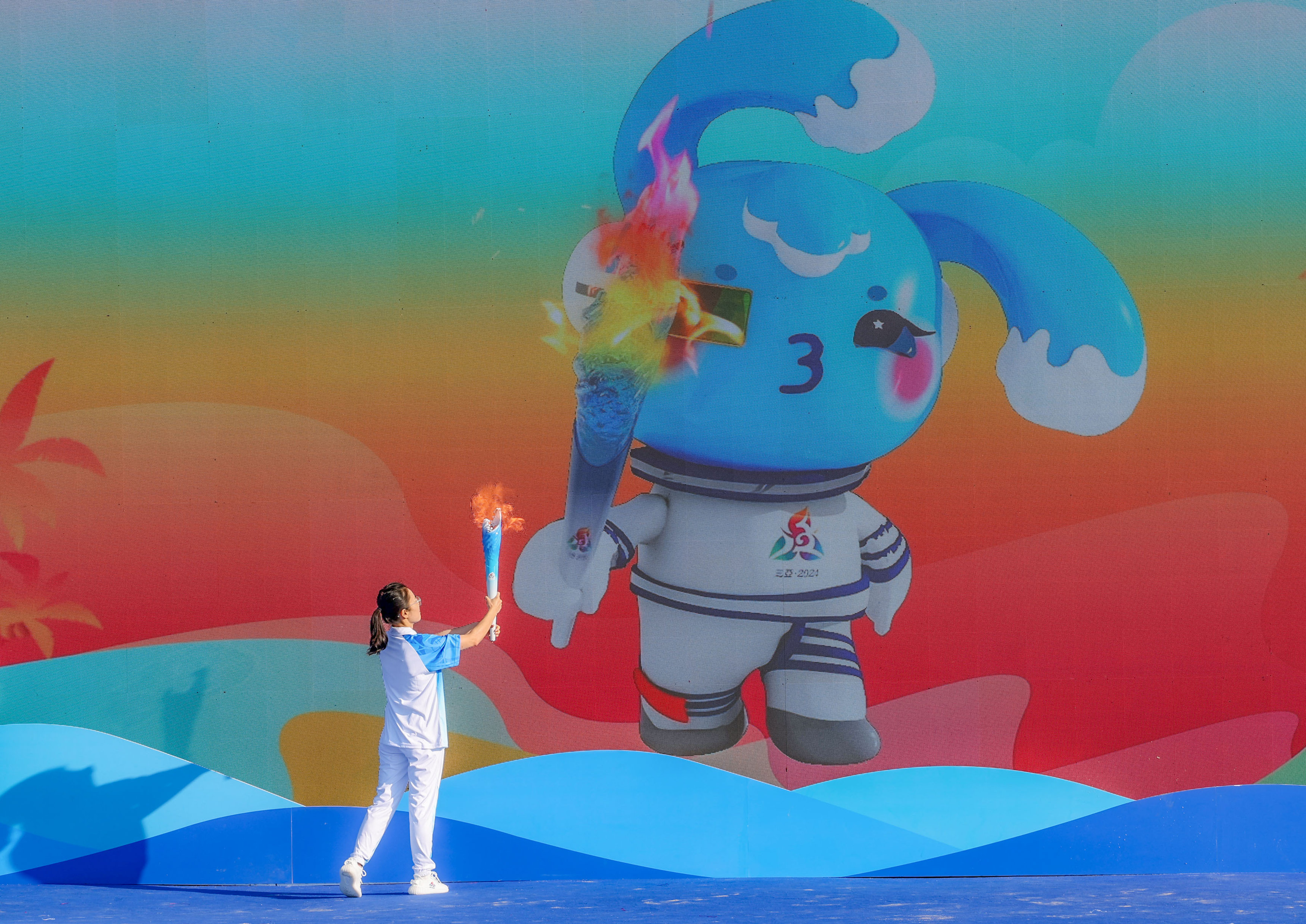 11月17日,火炬手韩晓燕在起跑仪式上与本届运动会吉祥物“吉贝”对接,点燃火炬。新华社记者 陈朔 摄