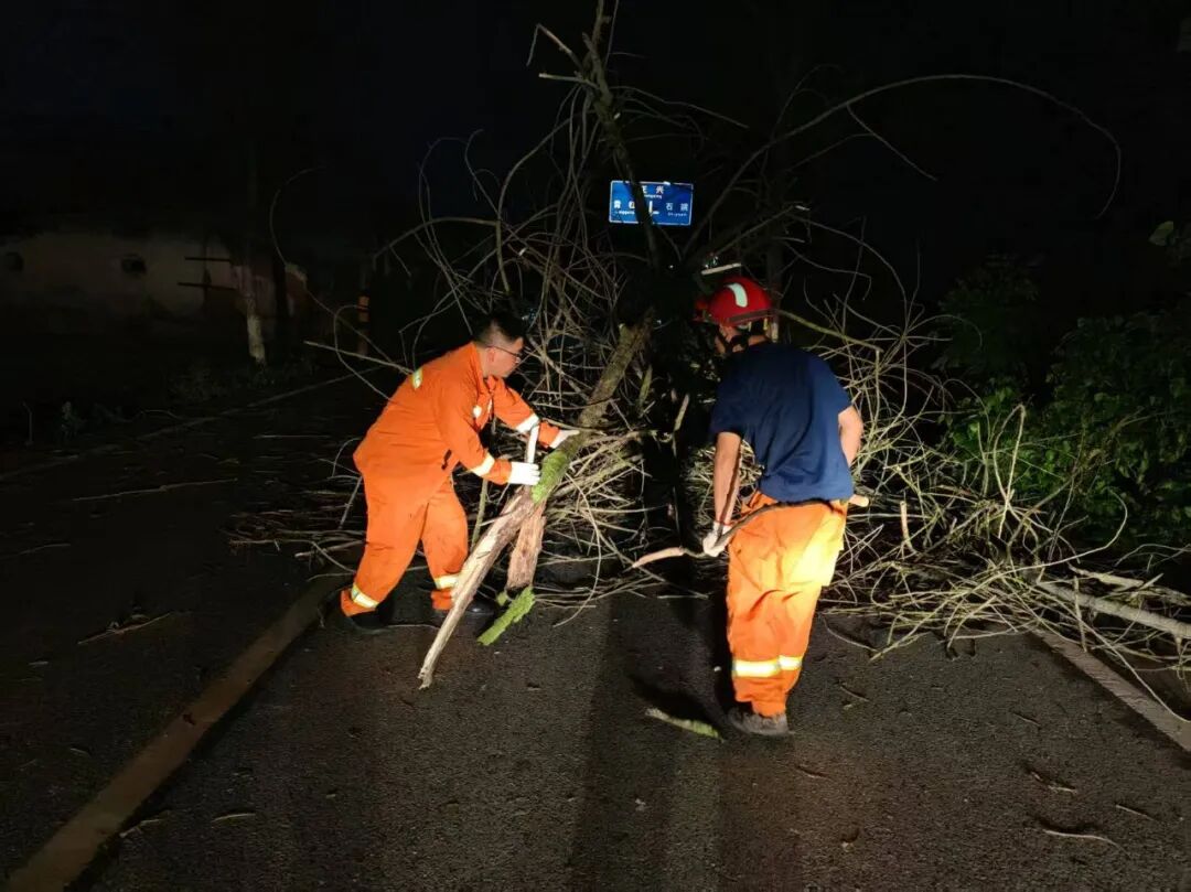 大兴镇抢修人员对倒伏占道树木进行收运