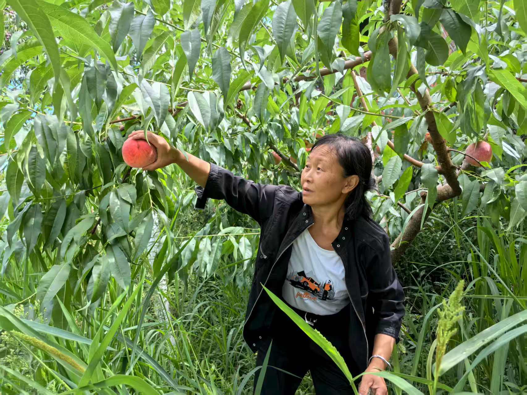 “这桃子可娇贵着呢,摘的时候不能碰伤表皮,否则就不好卖了。”余大姐边说边将摘下的桃子小心翼翼地放入果篮中。