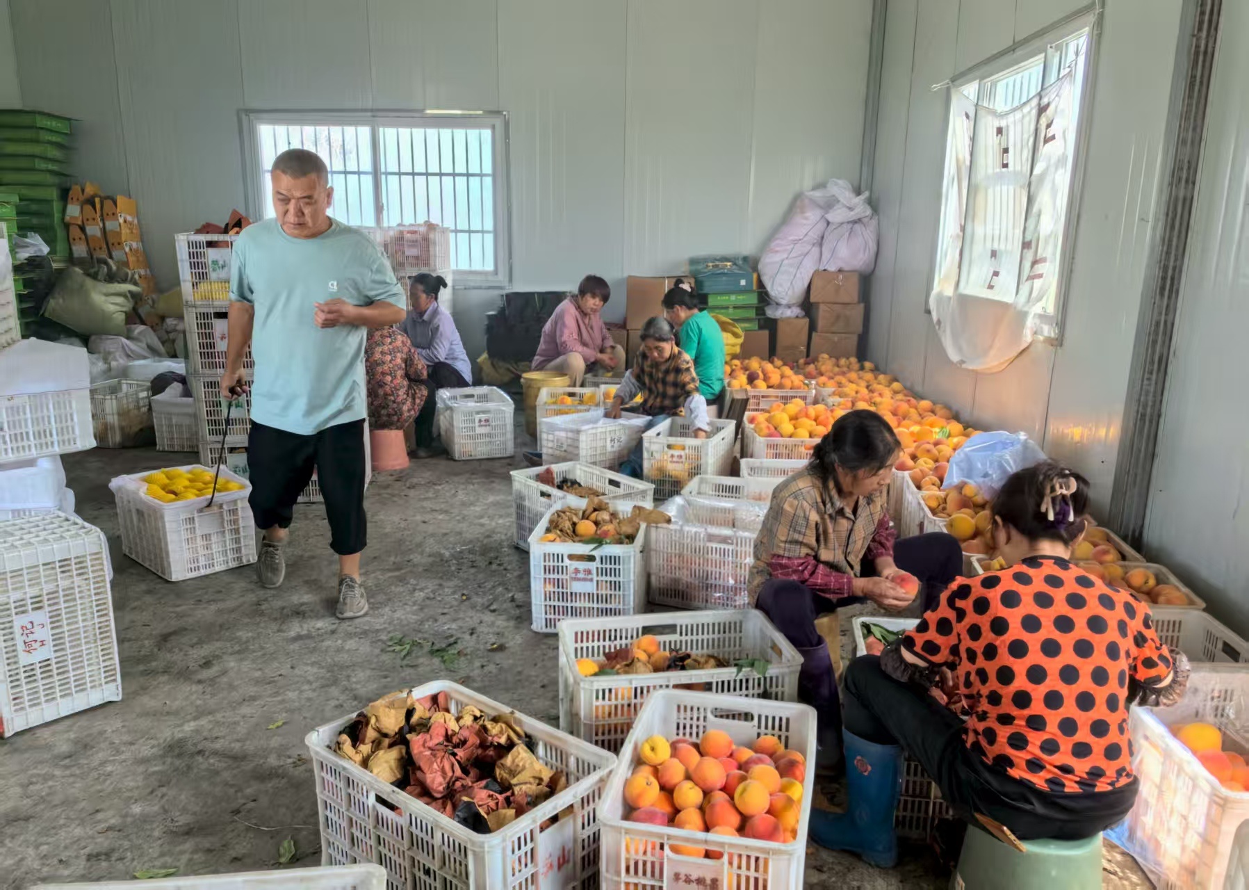村民将黄桃进行分拣装箱。夏荣伟 摄