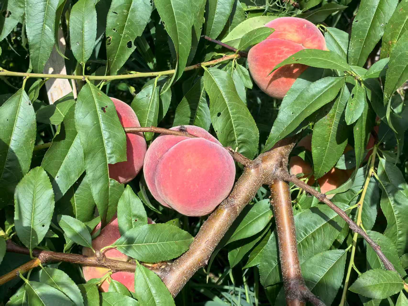 一大早,村民余大姐就和乡亲们一起,挎着果篮在桃林间忙碌。她双手灵活地翻转着一个个泛着玫瑰色红晕的香桃,动作娴熟地将果实轻轻摘下。