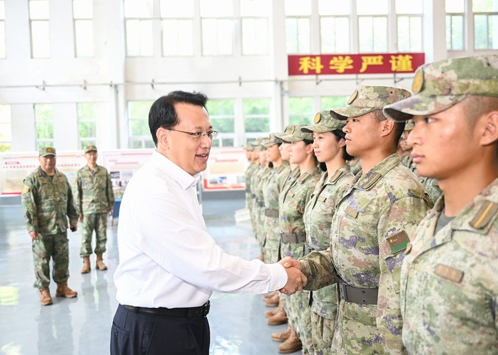 ▲7月31日上午,在联勤保障部队工程大学,市委书记袁家军同学员代表握手交谈。