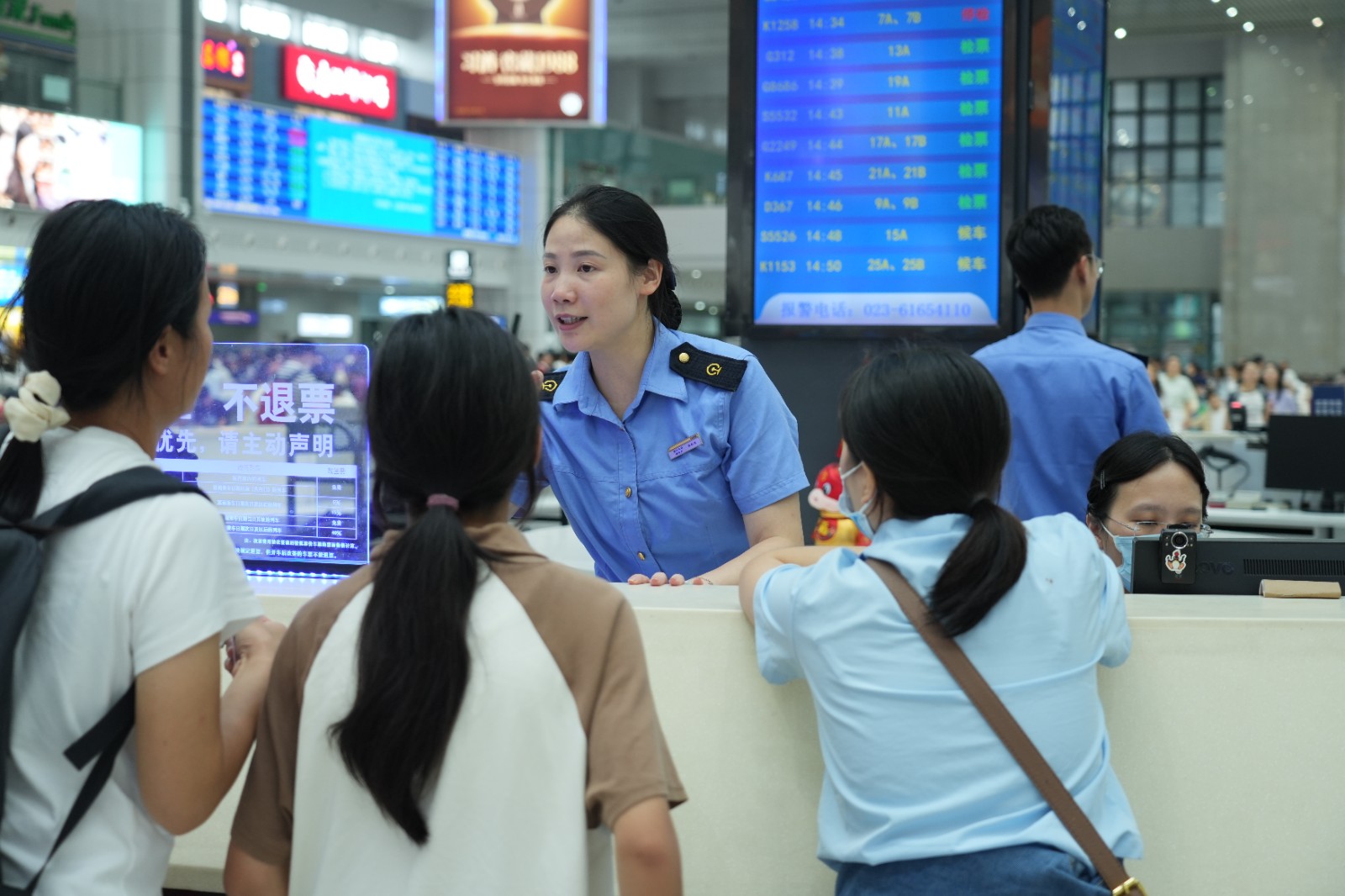重庆北站服务台工作人员回答旅客问询(魏伟 摄)
