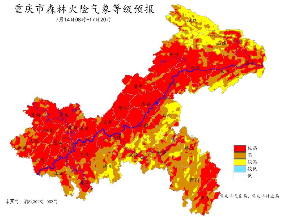 受晴热高温天气影响,预计14日至17日,重庆中西部大部地区、东北部部分地区和东南部局部地区森林火险气象等级极高;18日至19日,重庆大部地区森林火险气象等级高,局部地区等级极高。