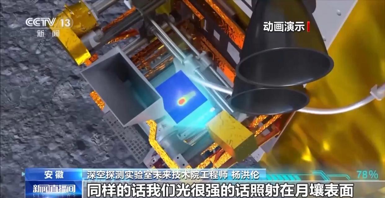 深空探测实验室未来技术院工程师 杨洪伦:利用一个跟踪机构追着太阳走,跟完太阳之后就通过类似于抛物面的东西把太阳光汇聚在一个点上。它传的是光能,热能是在月壤表面进行转化的。 光照射在月壤表面,光很强的话,月壤就会发热,就会熔融,这个能量比室外的太阳更强,达到3000倍。