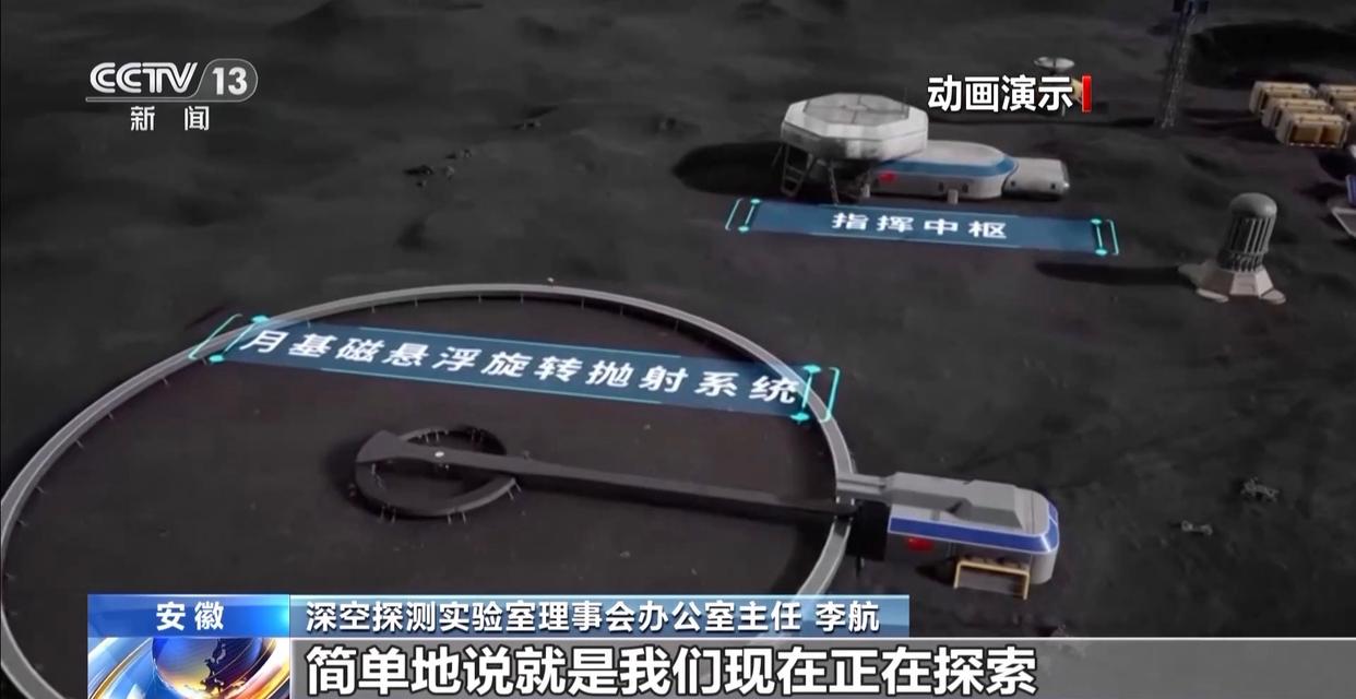 深空探测实验室理事会办公室主任 李航:这是目前我们正在论证的一个月基磁悬浮抛射系统。简单说,就是我们现在正在探索怎么样能够用高效的技术手段在月球表面收集氦-3,并且把它运回地球,我们目前有一种全新的技术设想,就是用磁悬浮抛射的方式把它甩回地球。