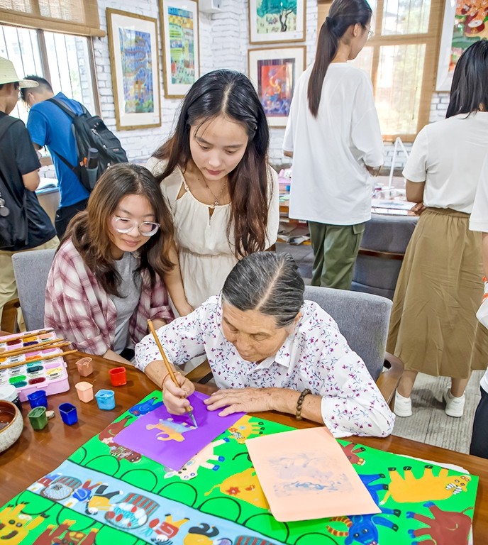 当天,北京大学中文系团委书记张辰带领该校16名2024级学生来到忠县磨子土家族乡村开展思政实践课。学生们在磨子乡村美术馆与画工们深入交流后,被他们背后的故事深深震撼,随后对两名70多岁的画工进行了深度采访,力求挖掘出土家老农与绘画结缘的乡土故事,回去后利用北大中文系的媒体平台进行宣传推介,扩大忠县“磨子土家画乡”的影响力和知名度。