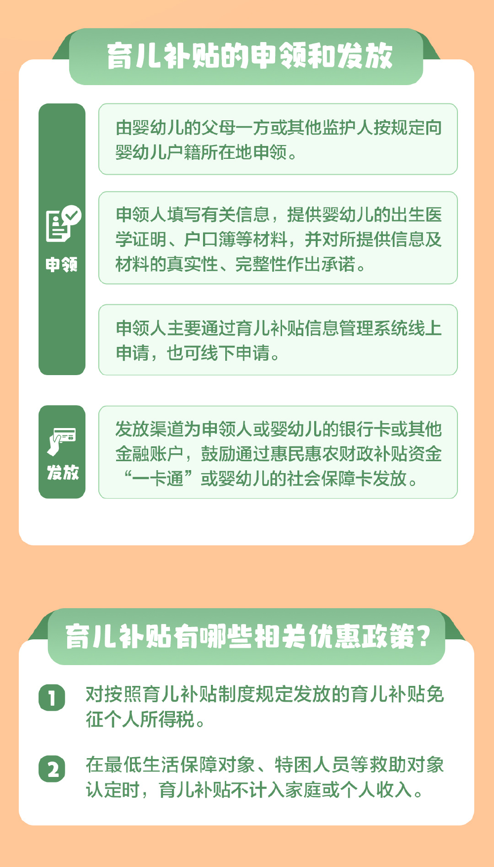 育儿补贴发放渠道为申领人或婴幼儿的银行卡或其他金融账户。对按照育儿补贴制度规定发放的育儿补贴免征个人所得税;在最低生活保障对象、特困人员等救助对象认定时,育儿补贴不计入家庭或个人收入。