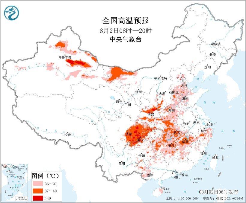 预计8月2日白天,华北南部、陕西中南部、黄淮中西部、江汉、四川盆地、江南大部、华南西部以及新疆北部和南疆盆地东部、甘肃西部、内蒙古西部等地的部分地区有35~39℃的高温天气,其中,新疆吐鲁番盆地、陕西关中平原、四川东部、重庆等地局地可达40℃及以上。