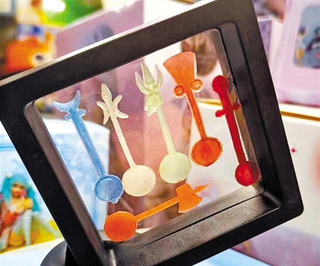 20世纪八九十年代,酸梅粉是孩子们的甜蜜慰藉。一毛钱一袋的棕色粉末,配着一把长度约两厘米的塑料小勺。勺把虽小,却承载着无限的童趣想象:孙悟空的金箍棒在勺柄上闪耀寒光,憨态可掬的小猪小狗栩栩如生,英姿勃发的水浒英雄……这些丰富多样、充满故事性的造型,成了孩子们争相收集的宝贝。