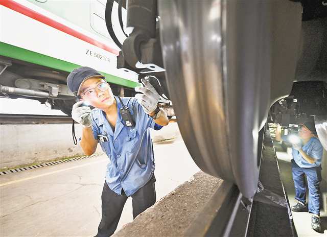 8月4日,重庆车辆段重庆北动力集中型动车运用车间,工作人员正在对车辆进行检查。记者 谢智强 摄/视觉重庆