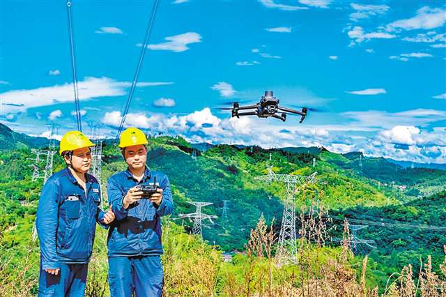 近日,国网重庆超高压公司输电运检人员在±800千伏金塘线,利用无人机开展红外测温工作。通讯员 李涛 摄/视觉重庆