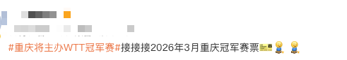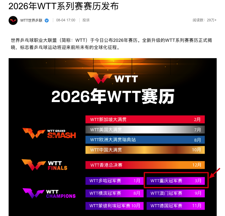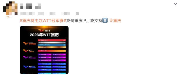 近日,@WTT世界乒联 发布了2026年WTT系列赛赛历。赛历中显示,WTT重庆冠军赛将在2026年3月举办。