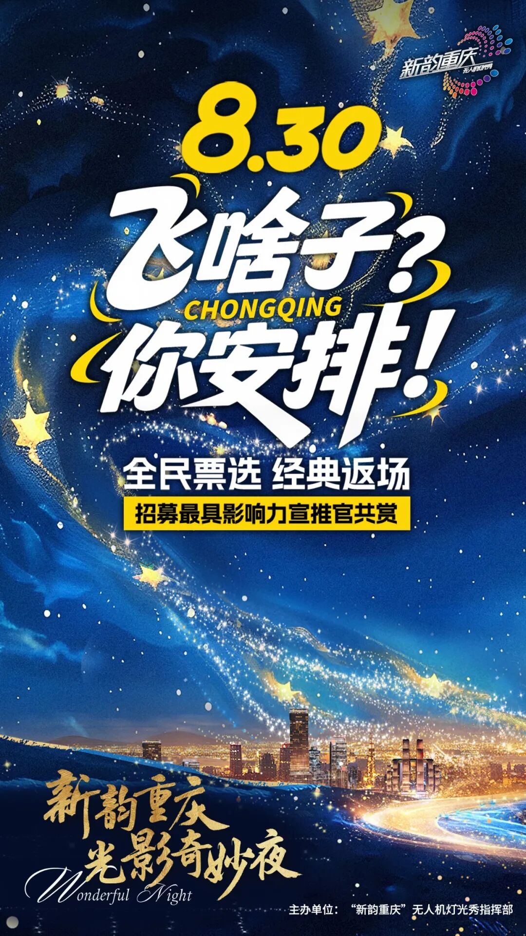 “新韵重庆”无人机灯光秀自2025年4月首秀以来,已成功举办二十余场展演,呈现百余幅空中艺术画卷,已成为展示重庆城市形象的文旅新名片。本次“新韵重庆·光影奇妙夜”活动创新推出“全民票选决定展演内容”的互动模式,邀请市民通过重庆日报、重庆之声、第1眼新闻、重庆卫视、重庆晚报、华龙网、上游新闻、重庆发布等官方平台,从30幅往期经典作品中投票选出10幅最喜爱的画面,得票最高的作品将在8月30日晚压轴展演。这一创意互动模式让市民真正参与到城市文化活动中,共同打造属于重庆的夜空艺术盛宴。