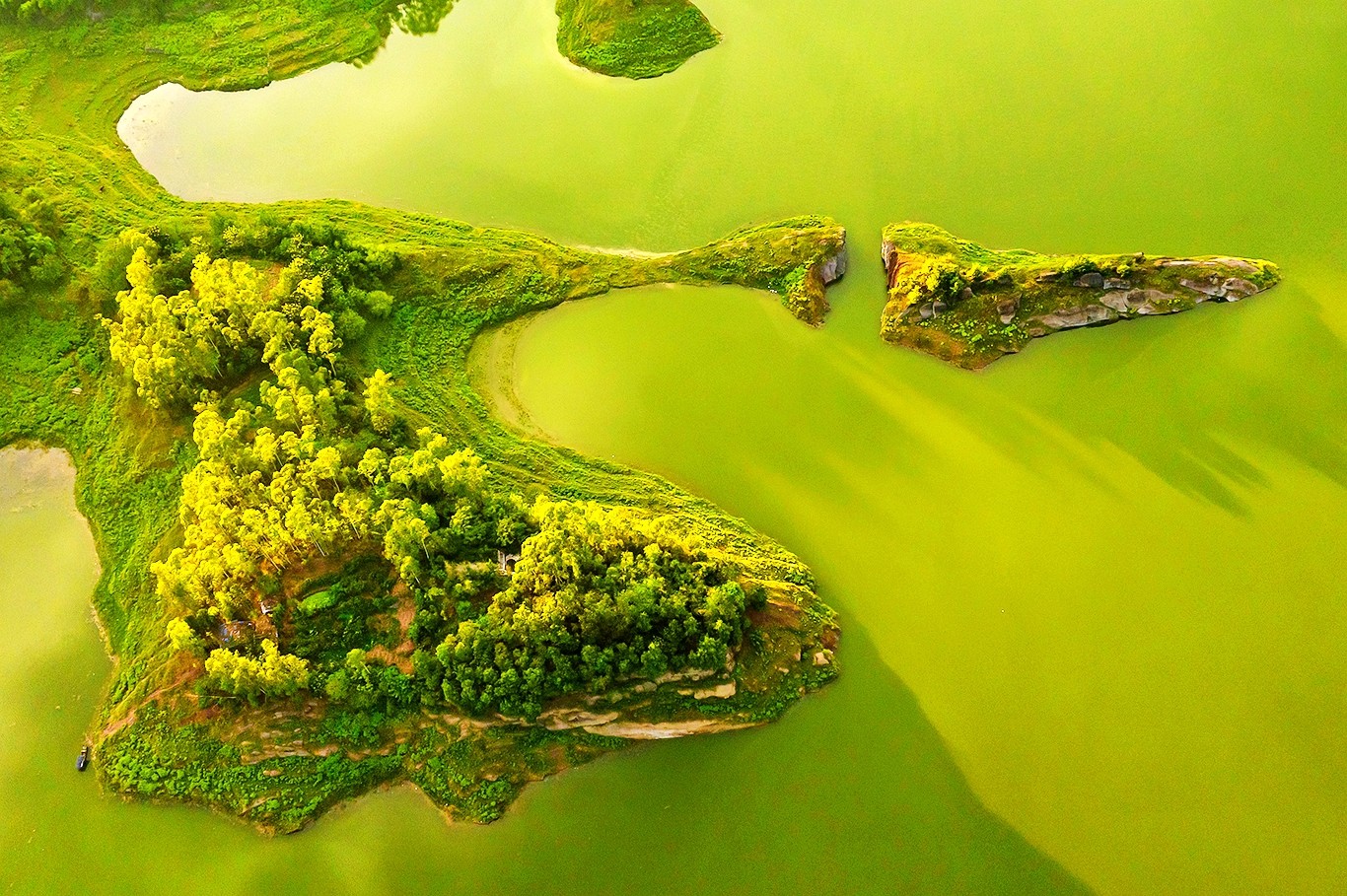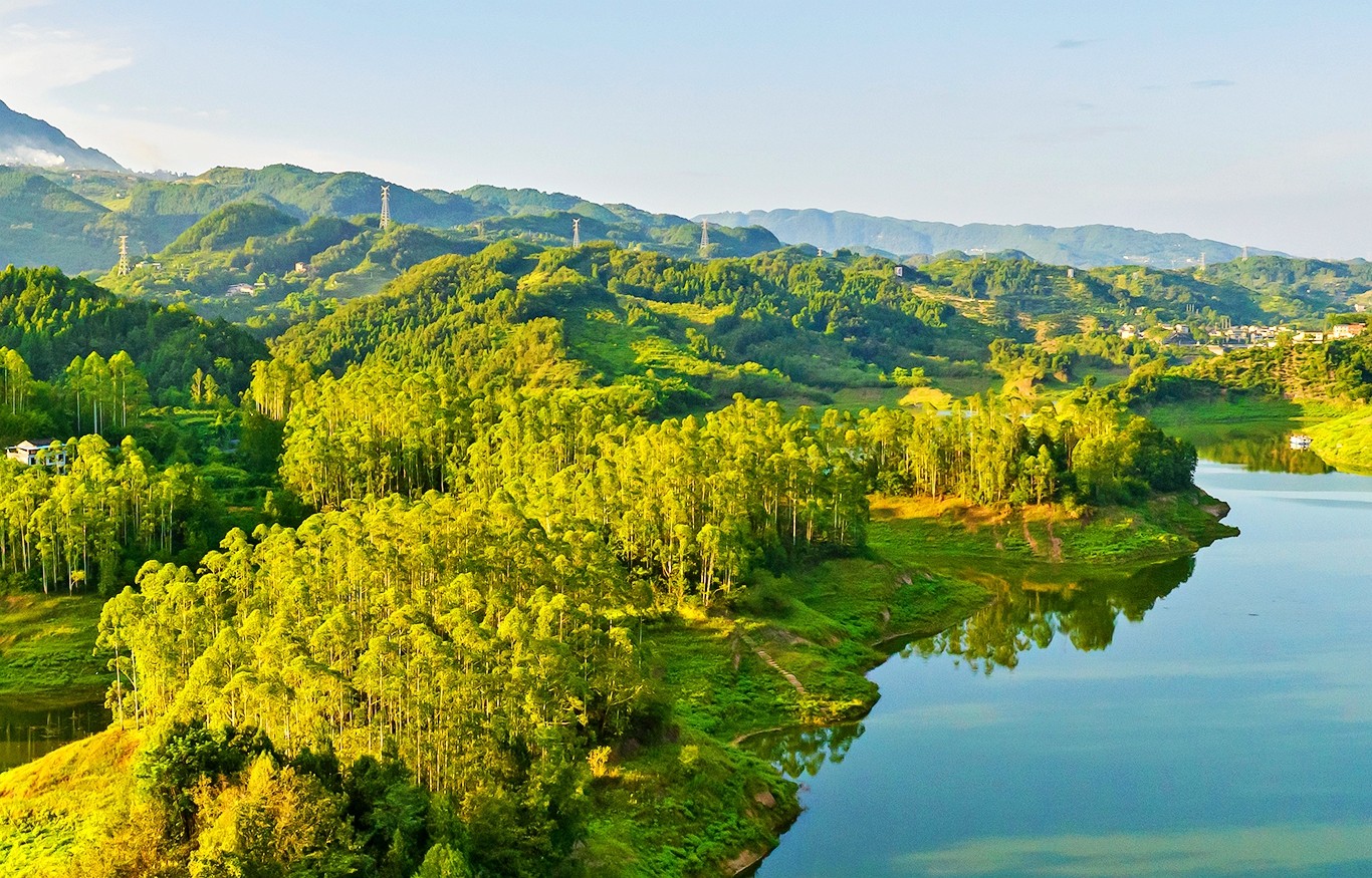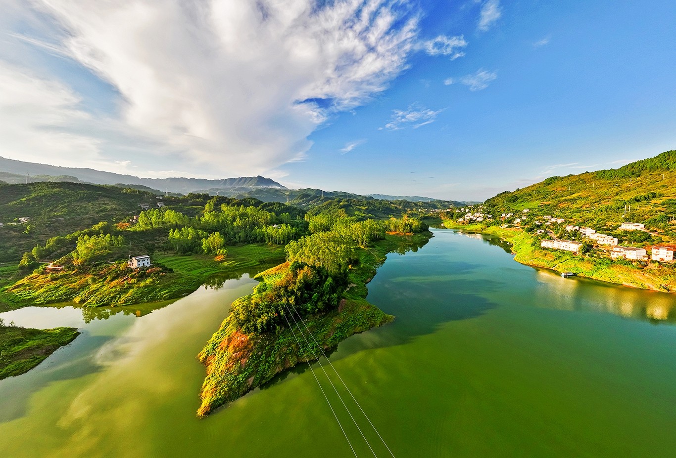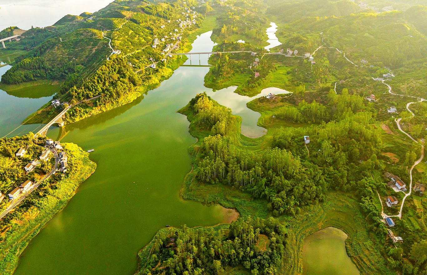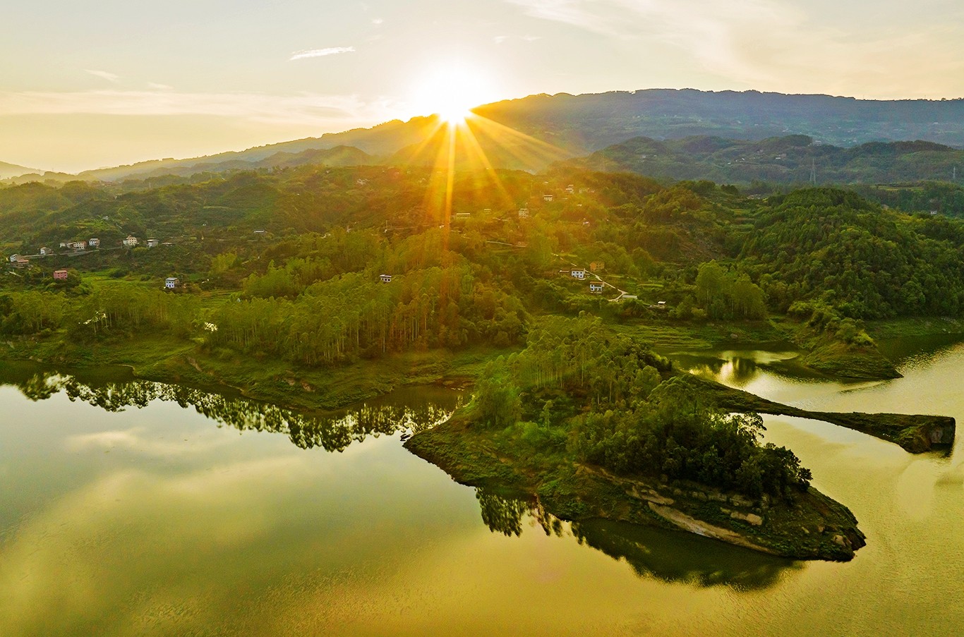 从空中俯瞰,河流如大地的脉络,蜿蜒穿梭于翠岭之间,村庄被绿树掩映,岛屿如碧螺静卧。日落时分,夕阳给大地镀上一层金辉,仿佛时间在此刻凝固,把喧嚣隔绝在外,只留这方自然绘就的静谧天地,让人想一直沉醉在这山水的温柔里。